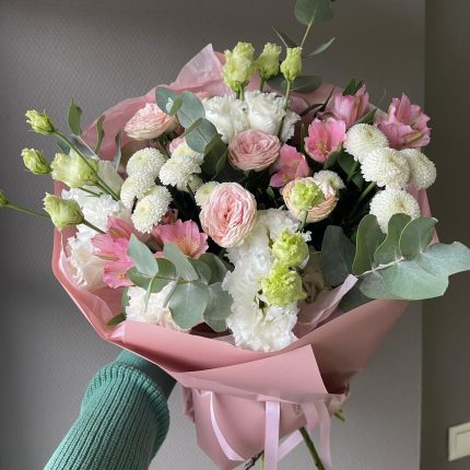 Авторский букет “Окно в сад”: пионовидная лилия, кружевная гвоздика и стойкая альстромерия