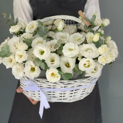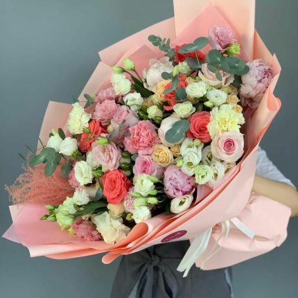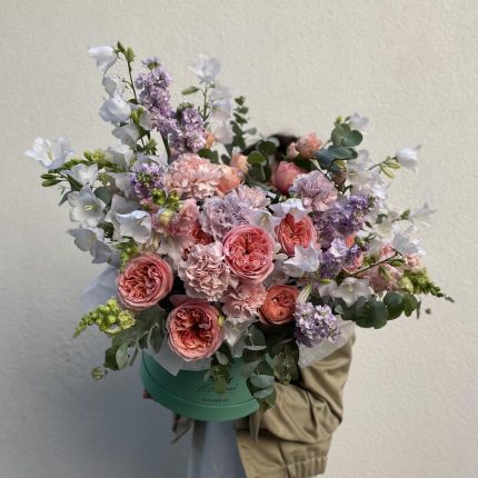 Бархатный цилиндр из голубых диантусов, розовых пионов и ароматной маттиолы