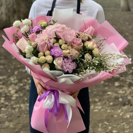 Большой букет с французскими розами, пион кустовой розой и гортензией