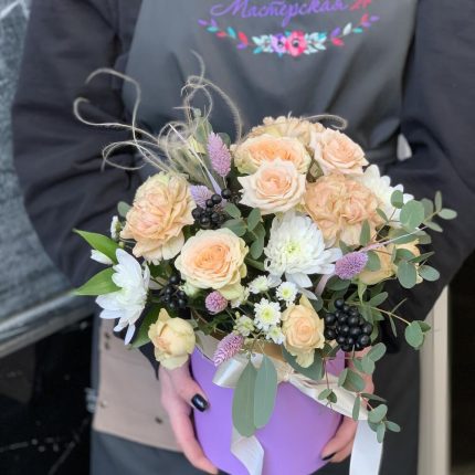 Шляпная коробка с садовыми розами Пинк Охара и маттиолой, розой Джульетта