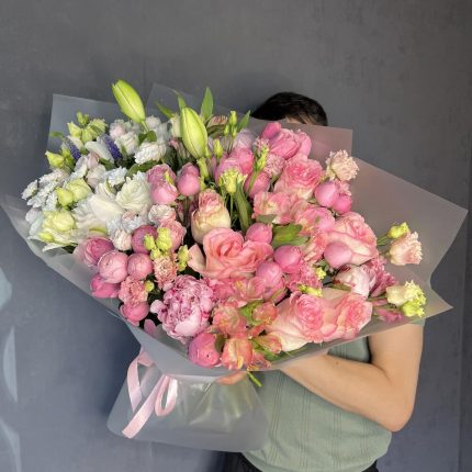 Букет из гортензии, гвоздик, гиперикума, эустомы, роз, эвкалипта и фисташки в плетеной корзине “Ариадна”