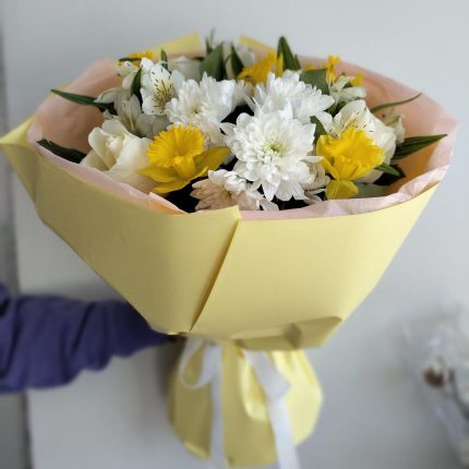 Альстромерии, Маттиола, Нарциссы, Полевые цветы, Ранункулюс, Розы, Ромашки