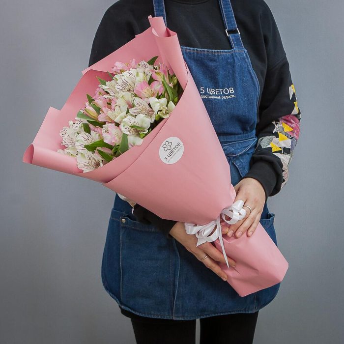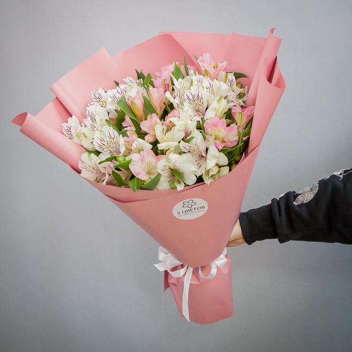 альстромерия белые – 8 шт.альстромерия розовые – 7 шт.Атласная лента – 1 шт.
