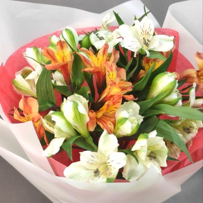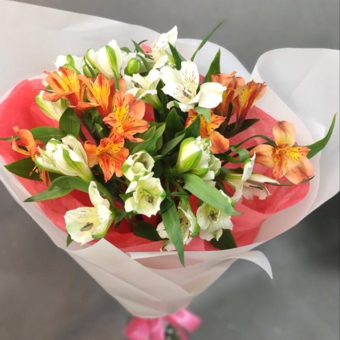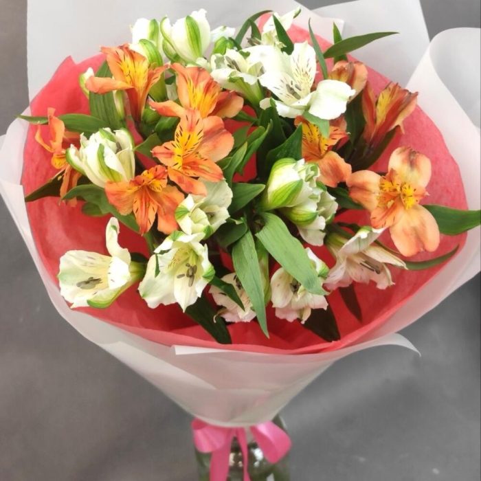 Микс из стойкой и нежной альстромерии в стильном оформлении.