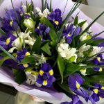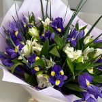 Букет из ярких фиолетовых ирисов и стойкой альстромерии