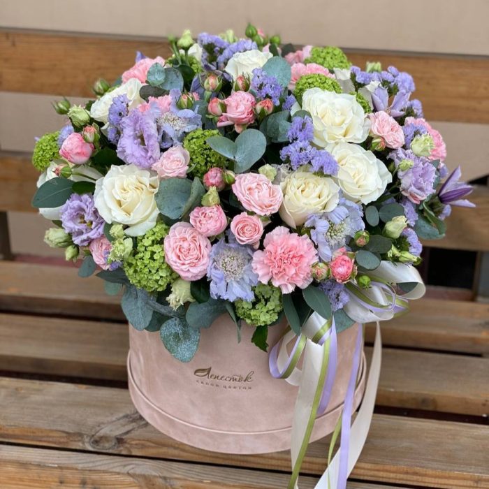 “Сиреневый туман” – композиция из гипсофилы в шляпной коробке