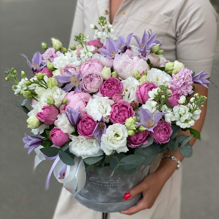 Бархатный цилиндр из тюльпанов, озотамнуса и пионовидной розы