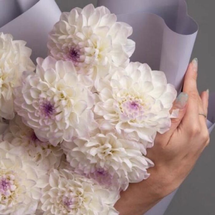 Георгина белая – 9 шт.Упаковка дизайнерская – 1 шт.Лента атласная – 2 шт.Открыточка с вашими пожеланиями – 1 шт.хорошее настроение – 100 шт.инструкция по уходу за цветами – 1 шт.коробка переноска – 1 шт.Кризал – 1 шт.