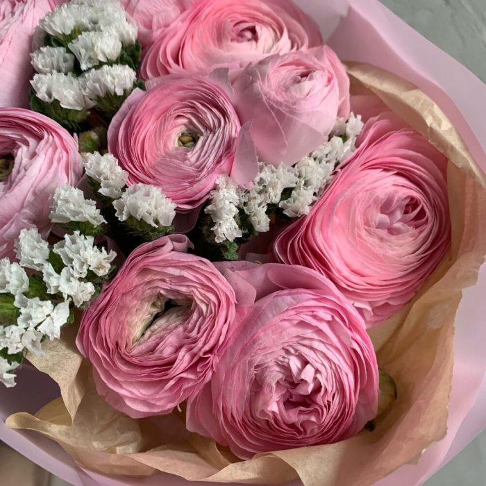 Лента – 1 шт.Статица – 2 шт.Упаковка – 2 шт.Ранункулюс – 9 шт.