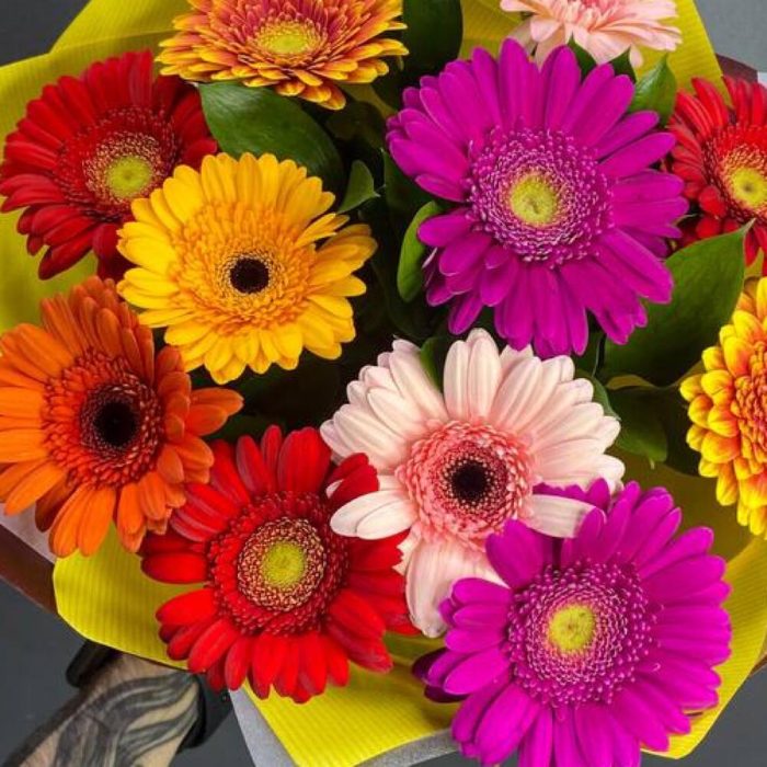 Рускус – 8 шт.Лента атласная – 1 шт.Гербера – 11 шт.Упаковка дизайнерская – 1 шт.