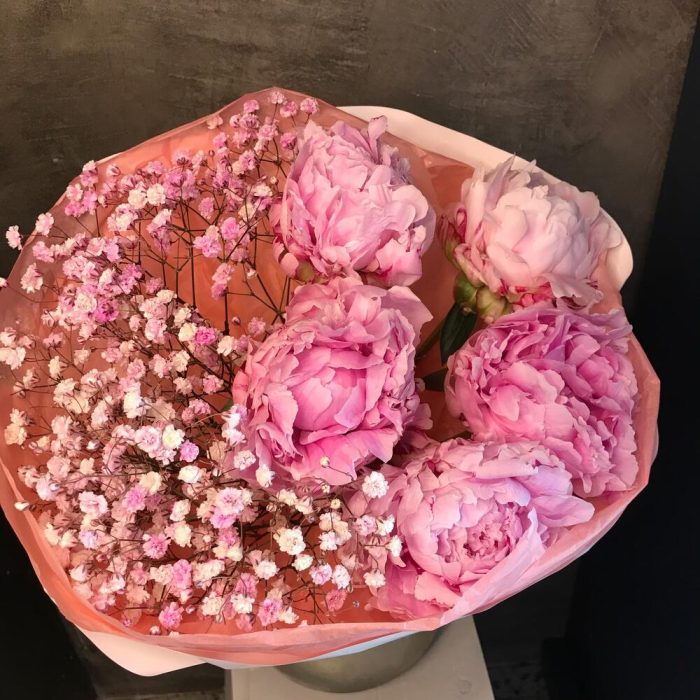 Гипсофила – 2 шт.Лента – 1 шт.Тишью – 2 шт.Пион Сара Бернар – 5 шт.Пленка матовая – 1 шт.Средство для продления жизни цветов – 1 шт.