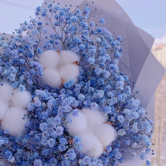 Лента атласная – 1 шт.Упаковка дизайнерская – 1 шт.Гипсофила голубая – 5 шт.хлопок белый – 3 шт.