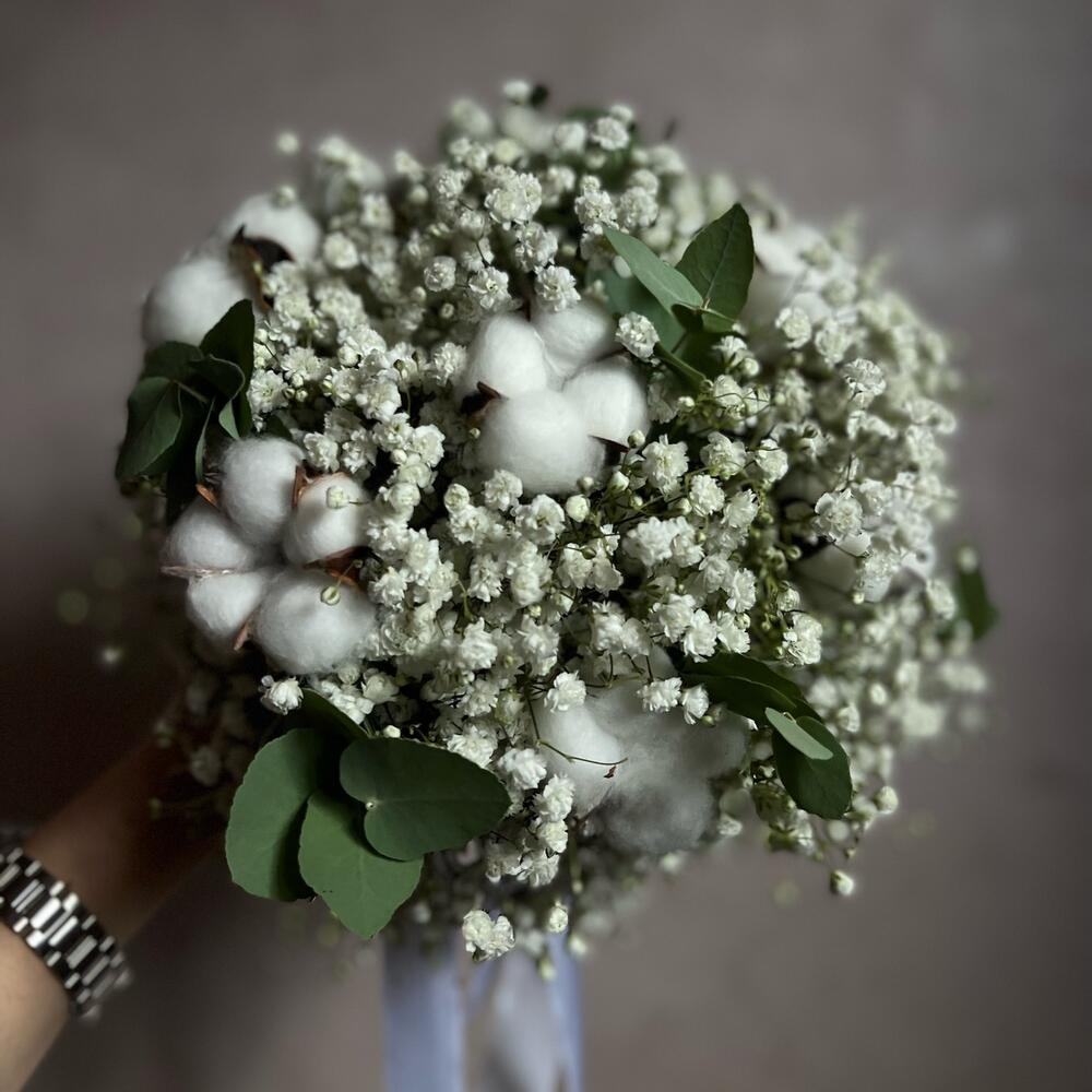 Гипсофила – 9 шт.Хлопок натуральный – 7 шт.Эвкалипт – 5 шт.Атласная лента – 2 шт.