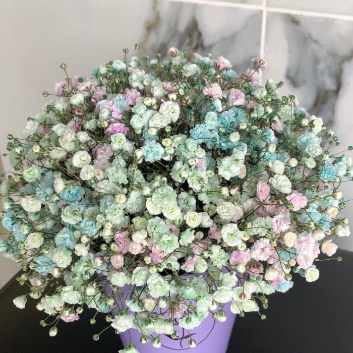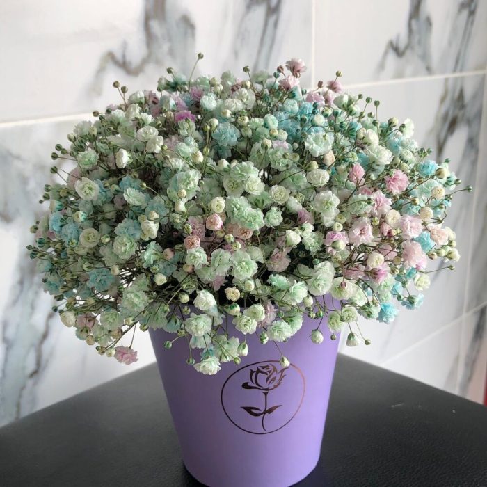 “Сиреневый туман” – композиция из гипсофилы в шляпной коробке