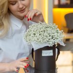 “Сиреневый туман” – композиция из гипсофилы в шляпной коробке