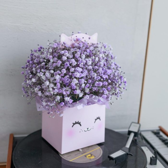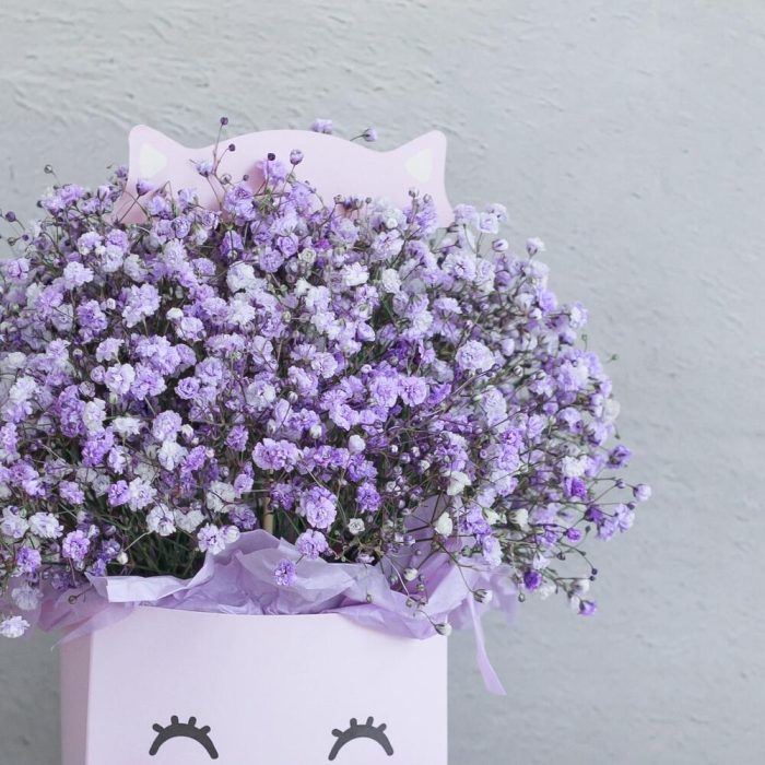“Сиреневый туман” – композиция из гипсофилы в шляпной коробке