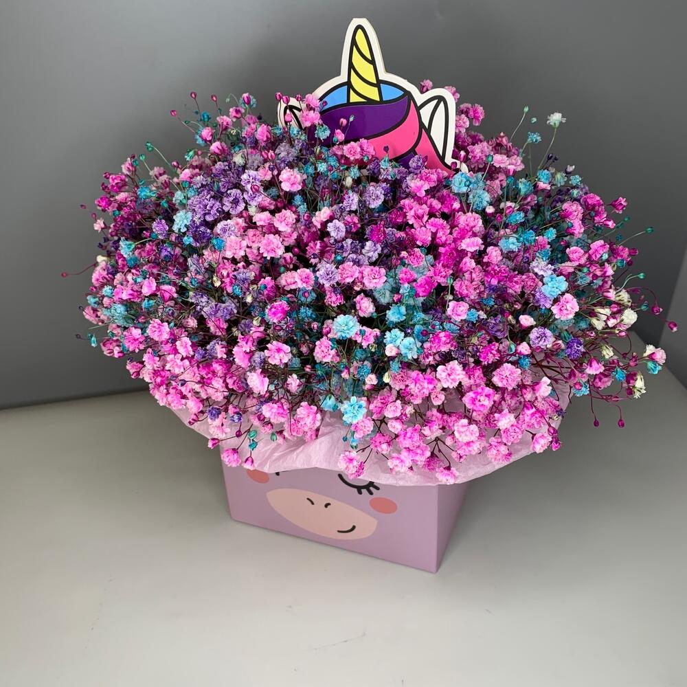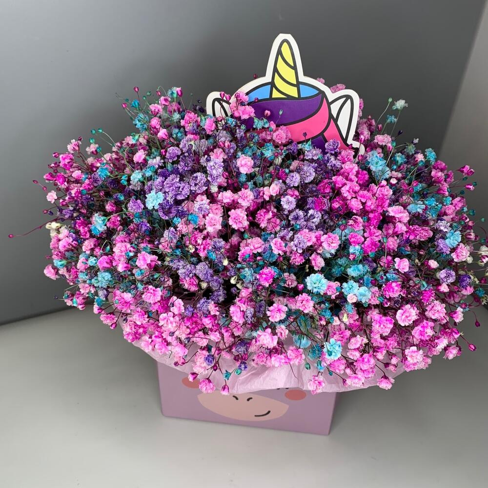 гипсофила радужная – 5 шт.Коробка – 1 шт.Тишью – 2 шт.Топпер – 1 шт.Пленка прозрачная – 1 шт.Лента атласная – 2 шт.
