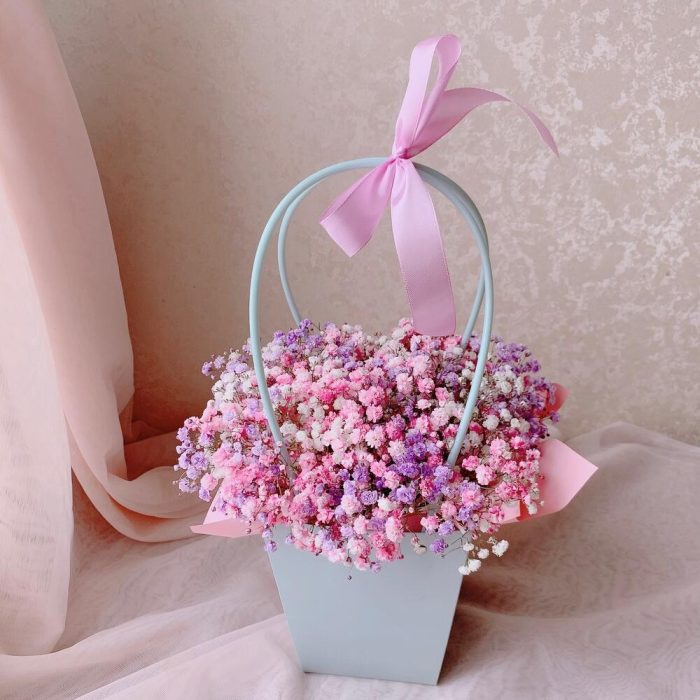 Лента атласная – 1 шт.Сумочка – 1 шт.Флористическая губка – 1 шт.радужная гипсофила – 5 шт.