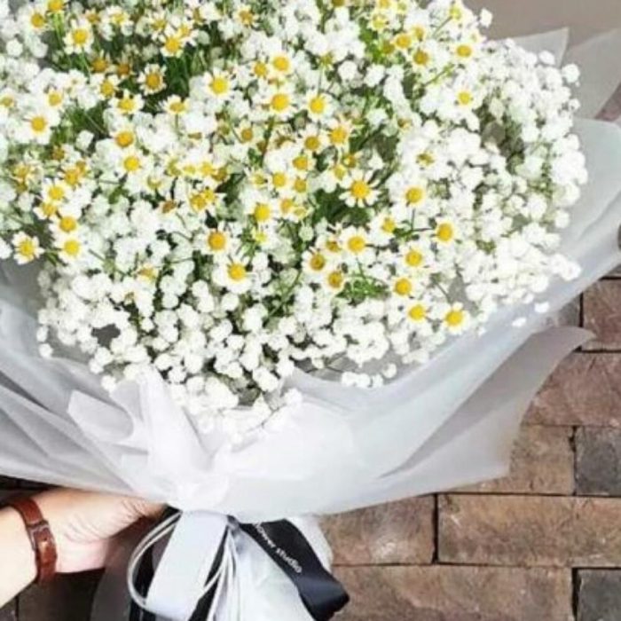 ромашки – 11 шт.Гипсофила – 10 шт.Упаковка дизайнерская – 1 шт.Лента атласная – 2 шт.Пакет подарочный – 1 шт.