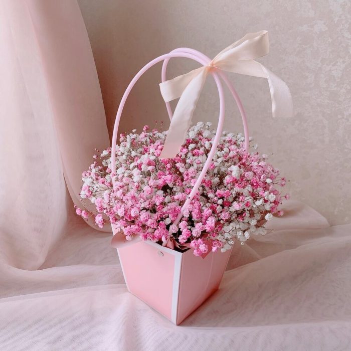 Лента атласная – 1 шт.Сумочка – 1 шт.Флористическая губка (оазис) – 1 шт.Гипсофила розовая – 3 шт.гипсофила белая – 2 шт.