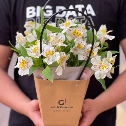 Авторский букет "Окно в сад": пионовидная лилия, кружевная гвоздика и стойкая альстромерия