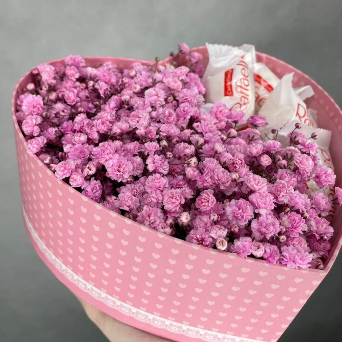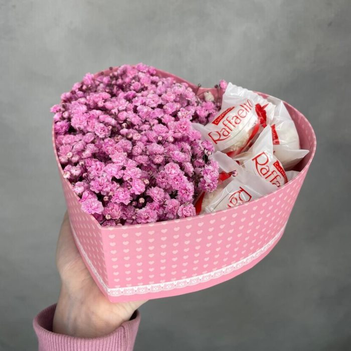 Гипсофила – 2 шт.Тишью – 1 шт.Коробка – 1 шт.Оазис флористический – 1 шт.конфета раффаэлло – 7 шт.