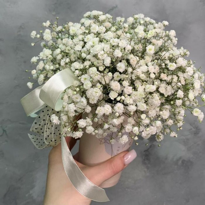 Гипсофила – 4 шт.Оазис флористический – 1 шт.лента бант – 2 шт.крафтовый дизайнерский Стакан – 1 шт.