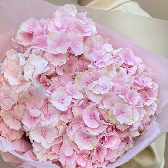 Лента атласная – 2 шт.Тишью – 2 шт.Упаковка дизайнерская – 4 шт.Гортензия розовая – 5 шт.