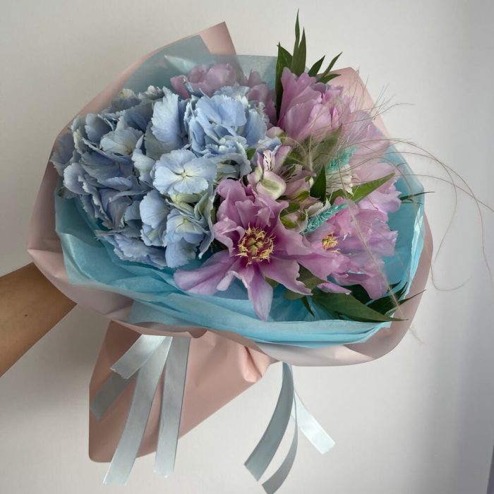 Альстромерия – 1 шт.Гортензия – 1 шт.Пион – 5 шт.Пленка – 6 шт.Колоски пшеницы – 2 шт.Стифа – 2 шт.