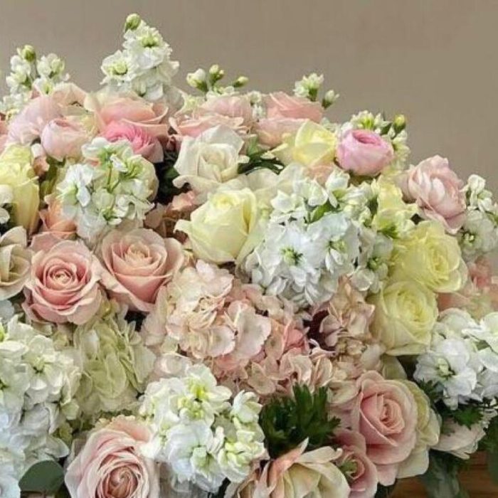 розы одноголовые – 40 шт.Маттиола – 45 шт.Гортензия – 10 шт.Корзина плетеная – 1 шт.Открыточка с вашими пожеланиями – 1 шт.хорошое настроение – 100 шт.инструкция по уходу за цветами – 1 шт.Оазис флористический – 1 шт.Кризал – 1 шт.