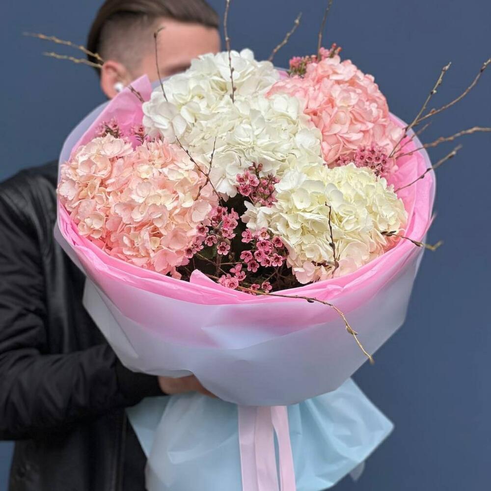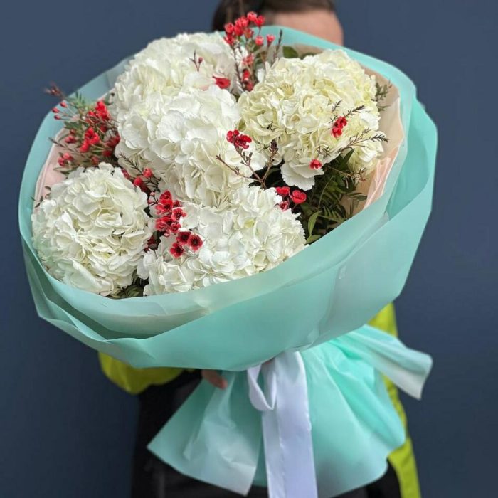Гортензия – 5 шт. фисташка зелень – 7 шт. Хамелациум – 3 шт. Упаковка дизайнерская – 6 шт. Лента – 1 шт.