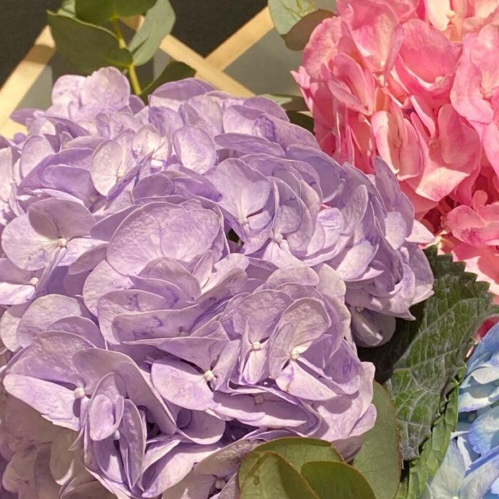Гортензия – 3 шт. Эвкалипт – 4 шт. Лента атласная – 3 шт. Тишью – 2 шт. Слюда упаковка – 2 шт. салфетка декоративная – 4 шт.