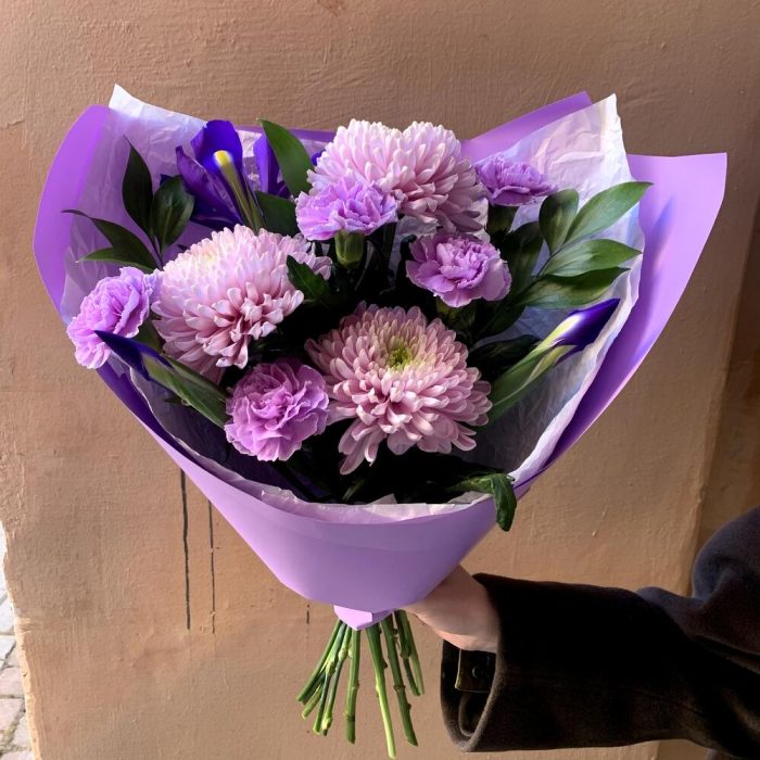 Авторский букет для ARMY “I purple you” с лунной гвоздикой, ирисом и хризантемой