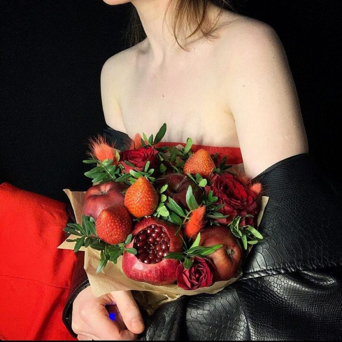 Яблоко – 8 шт.гранаты – 2 шт.Клубника – 5 шт.розы – 3 шт.розы кустовые – 3 шт.гвоздики – 3 шт.зелень фисташки – 2 шт.Лагурус – 6 шт.