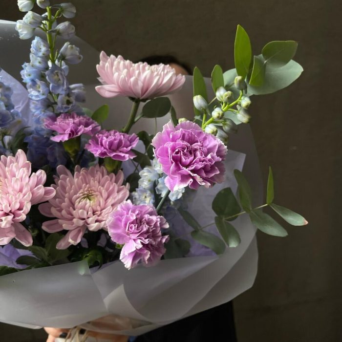 Дельфиниум – 3 шт.Эвкалипт – 2 шт.Хризантема – 3 шт.Гвоздика – 5 шт.Упаковка дизайнерская – 3 шт.