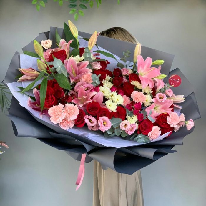 Авторский букет "Окно в сад": пионовидная лилия, кружевная гвоздика и стойкая альстромерия