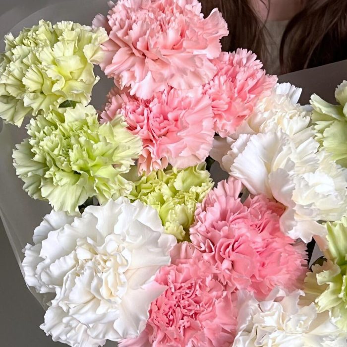 Лента – 1 шт.Диантус белый – 5 шт.Диантус розовый – 5 шт.Диантус салатовый – 5 шт.Дизайнерская упаковка – 1 шт.
