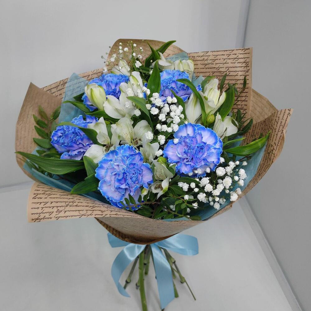 Букет из 5 Диантусов голубых, Альстромерии и Гипсофилы