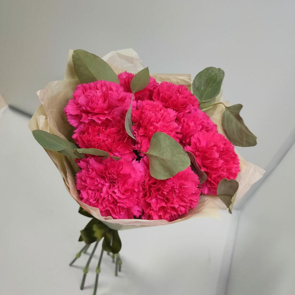 гвоздики – 9 шт.Эвкалипт – 1 шт.Дизайнерская упаковка – 1 шт.