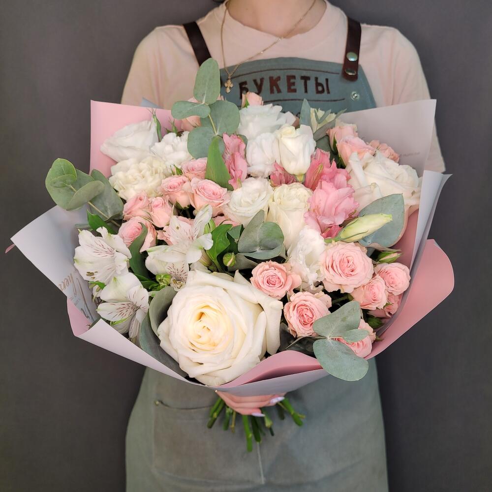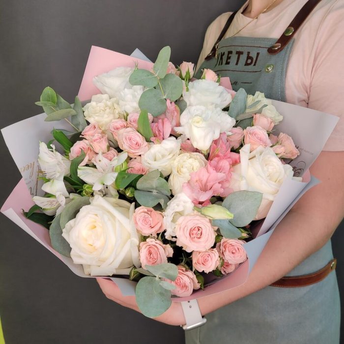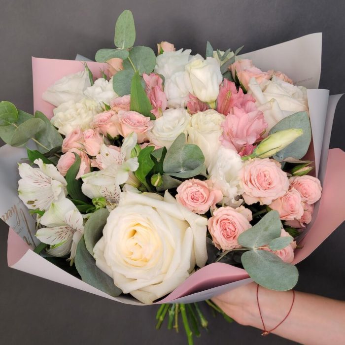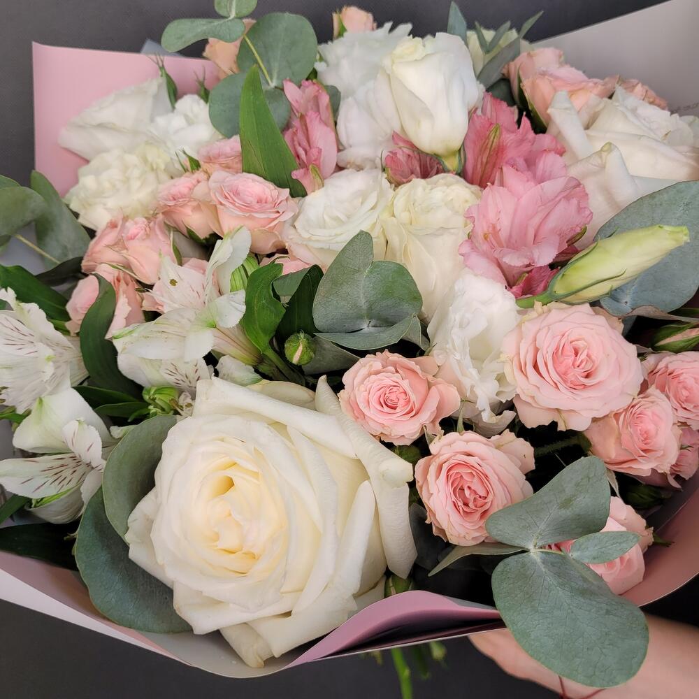 Букет роз , альстромерий и эвкалипта в дизайнерской упаковке
