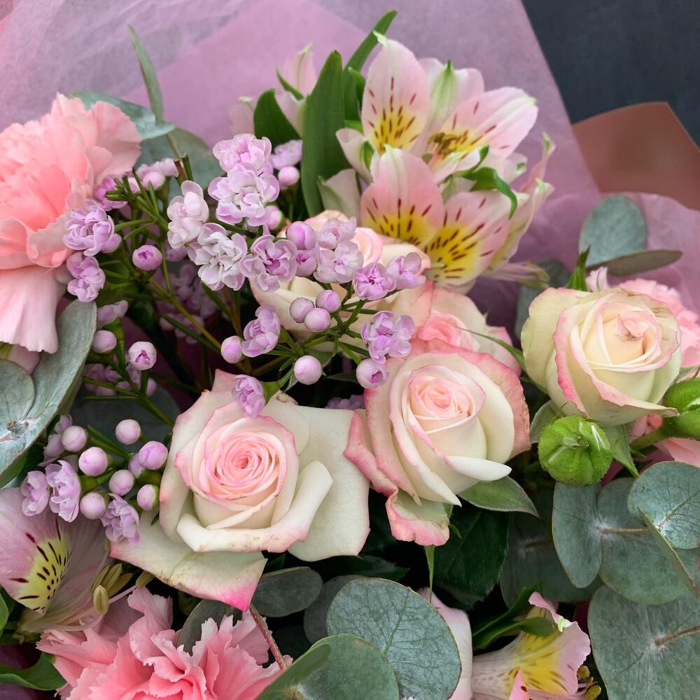 Букет с альстромериями, кустовой розой, гвоздикой и ваксфлауэром
