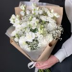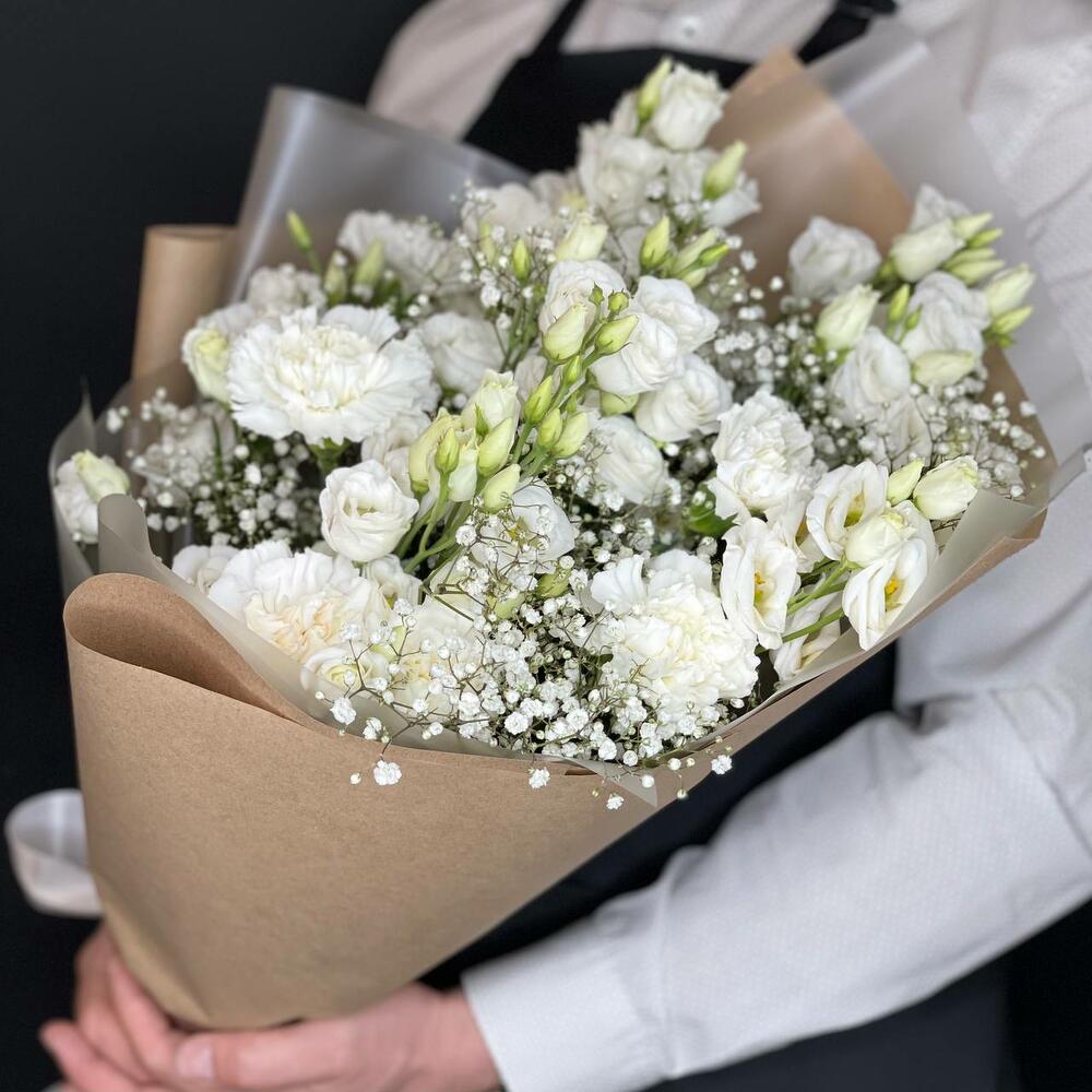 Диантус – 7 шт.Эустома – 5 шт.Гипсофила – 3 шт.Фисташка – 3 шт.Крафт – 3 шт.