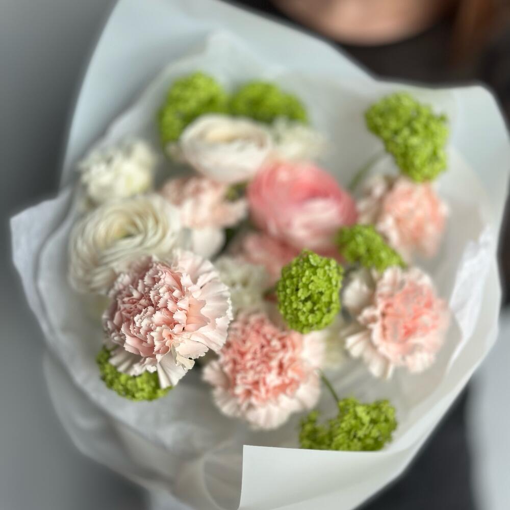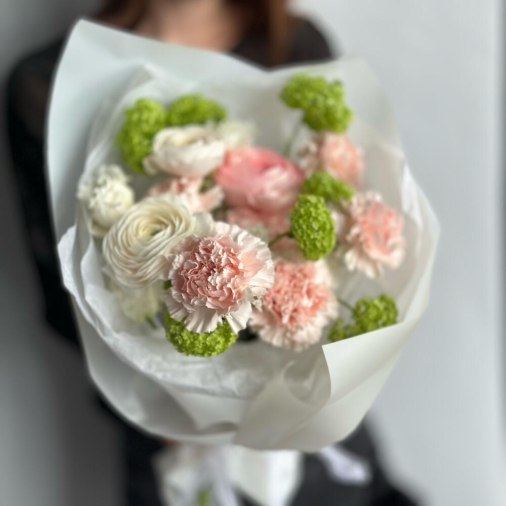 Ранункулюс – 3 шт.Вибурнум – 2 шт.Гвоздика – 6 шт.эустома белая – 2 шт.