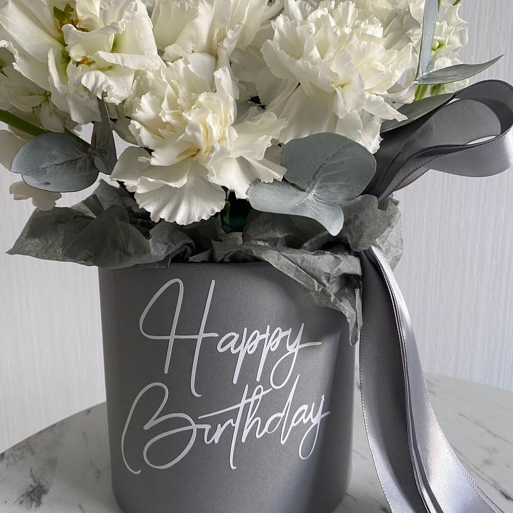 Цветы в коробке с надписью Happy Birthday