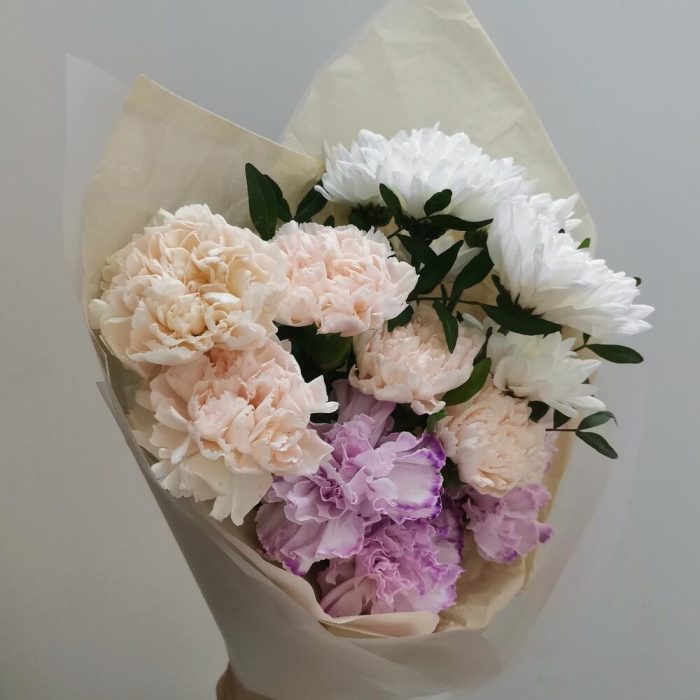 Хризантема кустовая – 1 шт.Гвоздика – 10 шт.Фисташка – 1 шт.Упаковка дизайнерская – 2 шт.