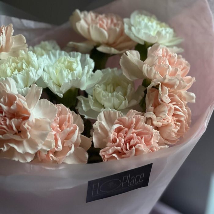 Диантус – 13 шт.Тишью белое – 1 шт.Пленка матовая – 1 шт.Лента атласная – 1 шт.