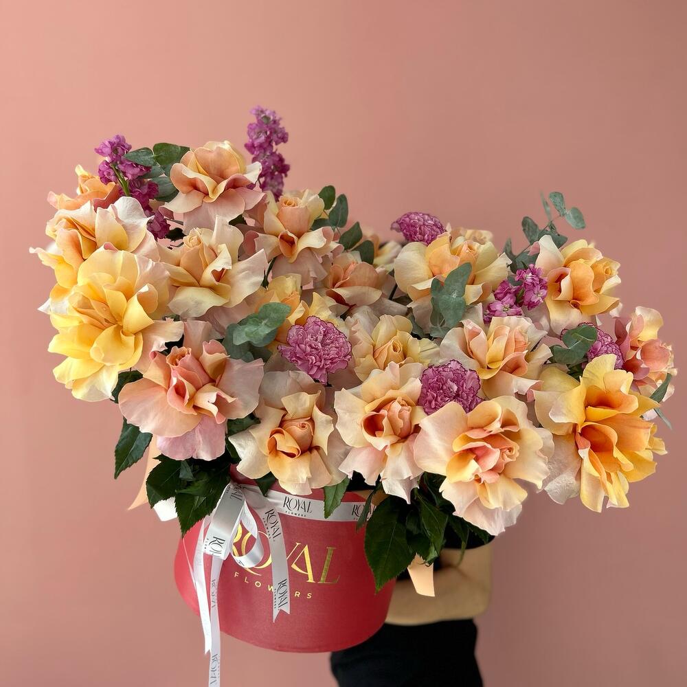 Эвкалипт – 3 шт. Гвоздика – 4 шт. Коробка – 1 шт. моттиола – 3 шт. розы – 23 шт.
