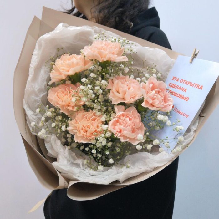 Диантус – 7 шт.гипсофила радужная – 2 шт.Упаковка – 1 шт.Лента атласная – 1 шт.