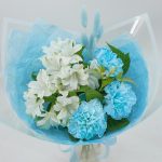 Упаковка дизайнерская – 1 шт.Лагурус – 5 шт.Средство для продления жизни цветов – 1 шт.рускус зелень ветка – 2 шт.альстромерия премиум – 2 шт.гвоздика молли голубая – 3 шт.