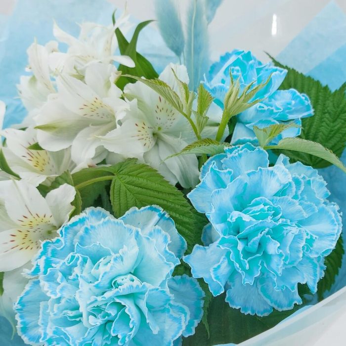 Упаковка дизайнерская – 1 шт.Лагурус – 5 шт.Средство для продления жизни цветов – 1 шт.рускус зелень ветка – 2 шт.альстромерия премиум – 2 шт.гвоздика молли голубая – 3 шт.